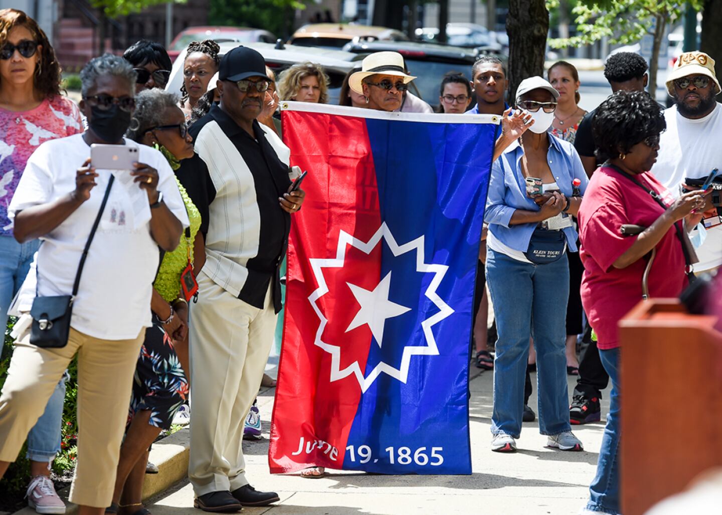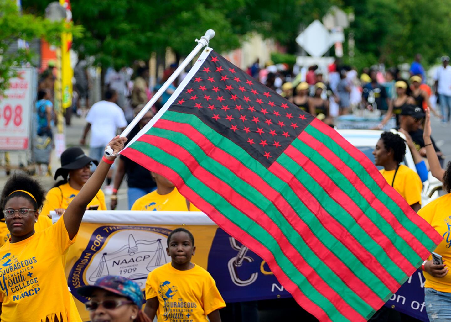 Marchers wave a black, green, and red version of the American flag in a Philadelphia Juneteenth parade. The flag, which combines the colors of Jamaican activist Marcus Garvey's pan-African flag with the traditional structure of the American flag, was designed by artist David Hammons. According to the Smithsonian Institution, Hammons has said that "[Garvey's flag] is so abstract, so pure, that the masses were frightened by it. I made my flag because I felt that they needed one like the U.S. flag, but with black stars instead of white ones."