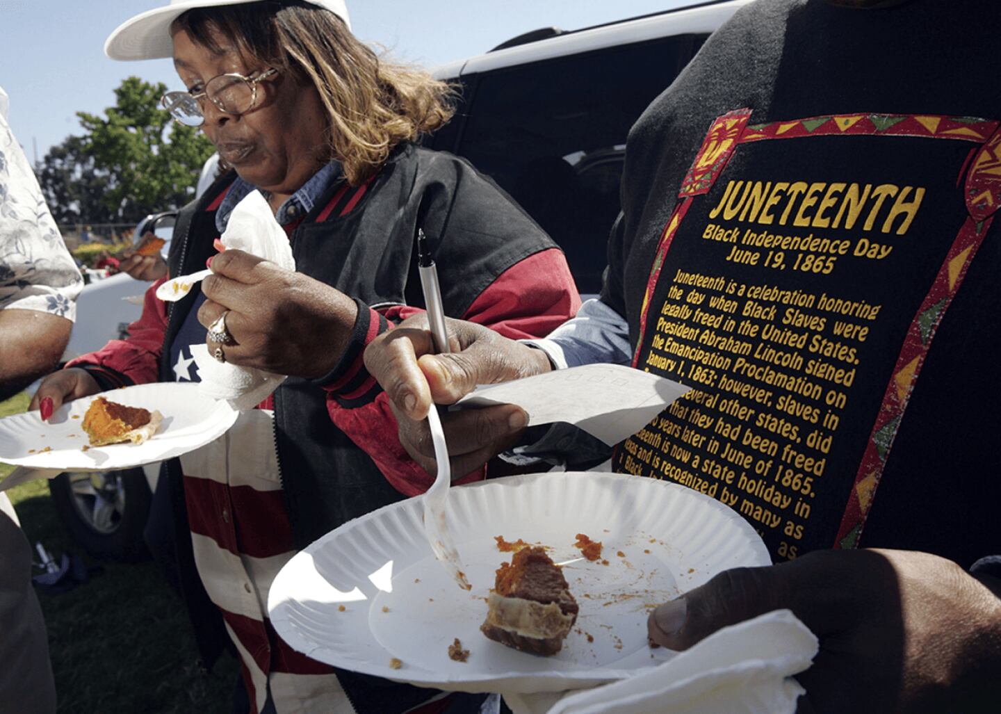 Two people taste entries in the sweet potato pie cook-off contest during a Juneteenth celebration in Richmond, California. NPR reports that Black people who were enslaved had been cooking with sweet potatoes for centuries because the tubers are similar to yams, a root vegetable commonly eaten in West Africa. Over the years, dishes like sweet potato pie have become hallmarks of Black cuisine.