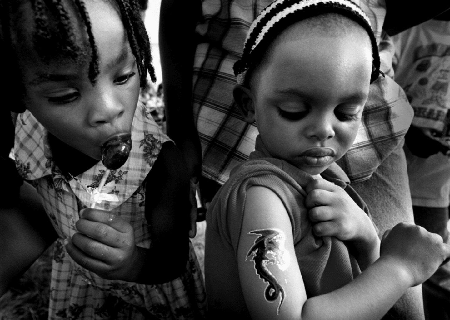 Two children enjoy a Juneteenth carnival with candy and temporary tattoos at Washington D.C.'s Anacostia Museum. Part of the Smithsonian Institution, the community-based museum displays exhibitions about African American history and culture. The Anacostia Museum still operates today and has one of the largest collections of Black historical artifacts in the country.