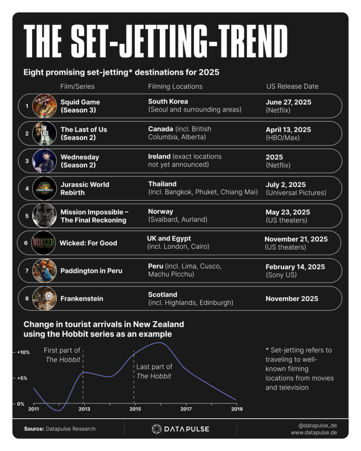 Traveling to famous filming locations is no longer a niche trend. Twenty years ago, "The Lord of the Rings" trilogy drew tourists to New Zealand. Today, fans of "White Lotus" are flocking to the paradisiacal settings featured in the hit U.S. series. DataPulse Research reveals which destinations are poised to become must-visits for set-jetters in 2025.