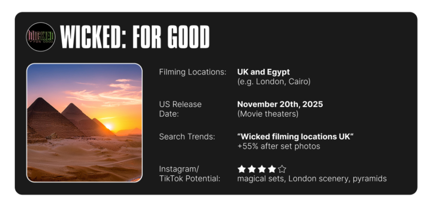 Visitors to Britain’s official tourism site will already find an entire page dedicated to advertising the pastoral settings of last year’s hit “Wicked.” Since its release in fall 2024, some 40 million Americans have seen the film in theaters. This fall, “Wicked: For Good” will bring Oz to life using many of the same English countryside vistas from the first film, along with landscapes from Egypt’s White Desert National Park.