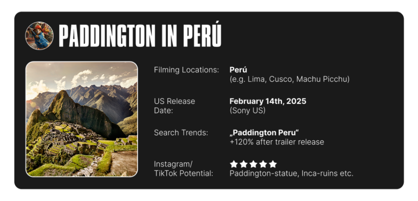 The fall 2024 release from the Paddington franchise earned more than $43.5 million at the American box office. While the film relies heavily on computer-generated imagery for its main character, it also features real Peruvian sites and traditional Peruvian woven art. Like the British tourism ministry, the Peruvian tourism commission has carefully sought to link the film to its setting by offering background on the scenes of the film via the web.