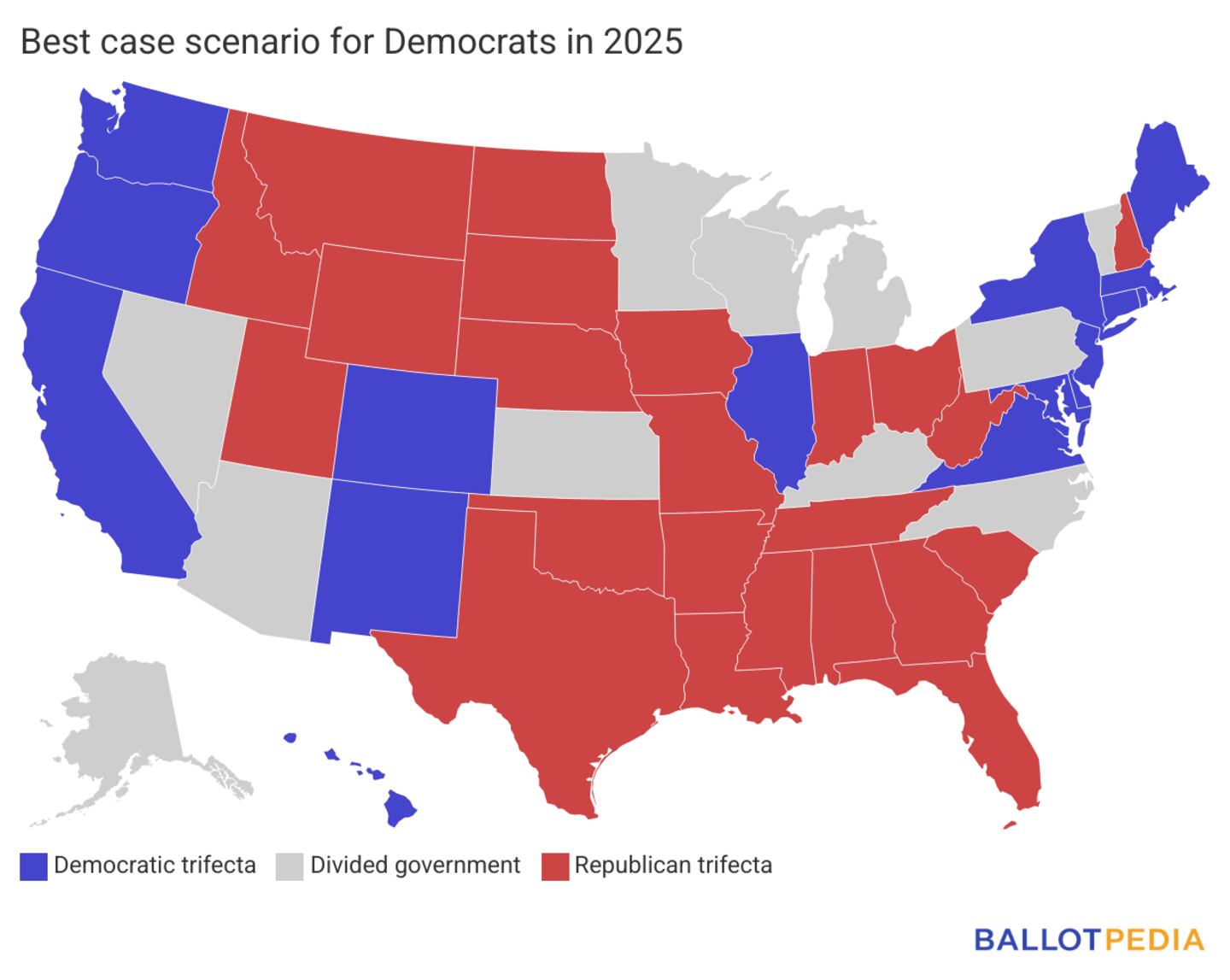 The Democrats' best-case scenario is to retain their trifecta in New Jersey and win a trifecta in Virginia, increasing the total number of Democratic trifectas to 16 nationwide. Virginia Democrats need to maintain their House majority and gain the governor's office to obtain trifecta control in the state. Democrats in New Jersey need to maintain both their House majority and the governor's office to retain trifecta control in the state.