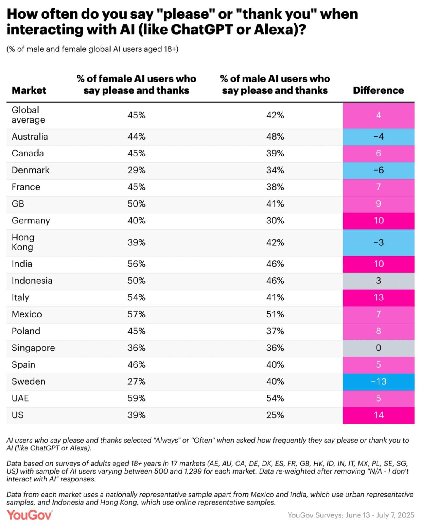 While women are generally more likely to say "please" and "thank you" when interacting with AI assistants, both Nordic countries in YouGov’s survey buck this trend.