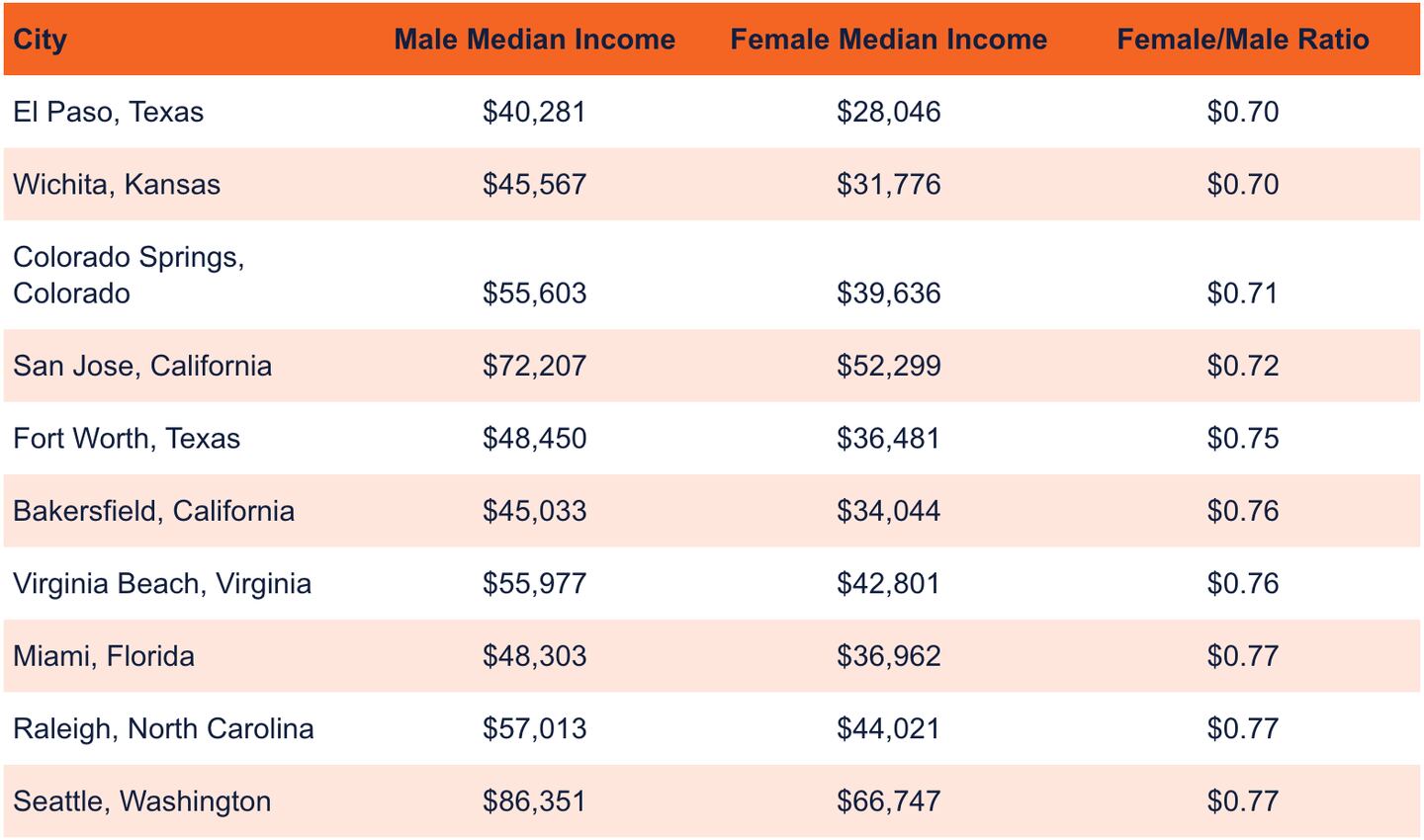 Among large cities, defined as those with populations greater than 350k, El Paso TX has the largest wage gap with female workers only earning 70 cents for every dollar men earn.