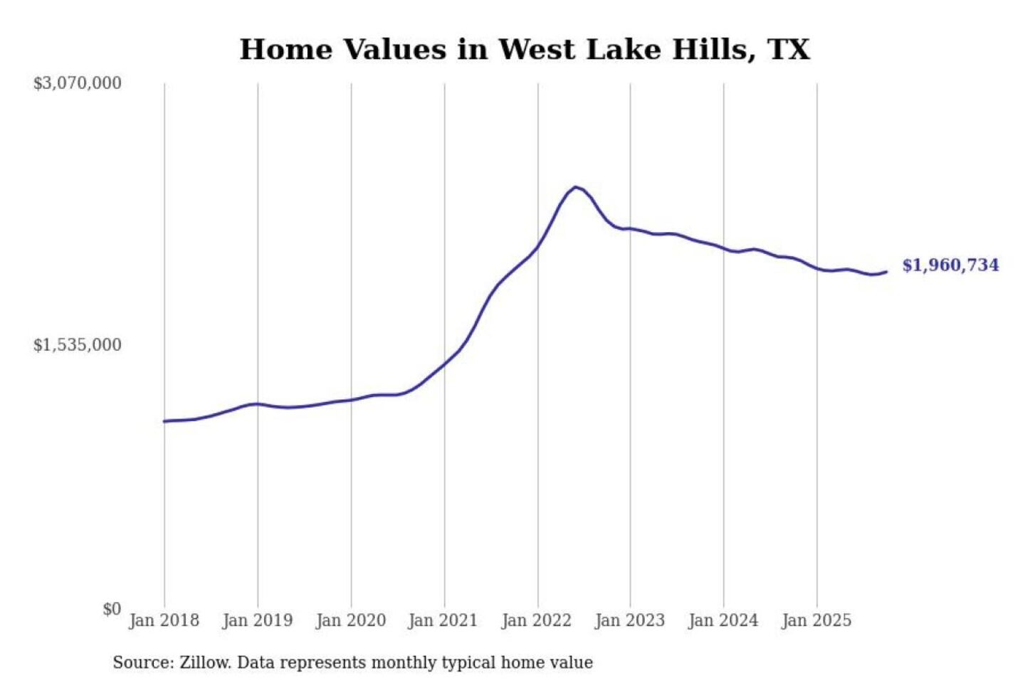 Stacker compiled a list of cities with the most expensive homes in the Austin metro area using data from Zillow. Charts show the monthly typical home value since January 2018. Data was available for 53 cities and towns.