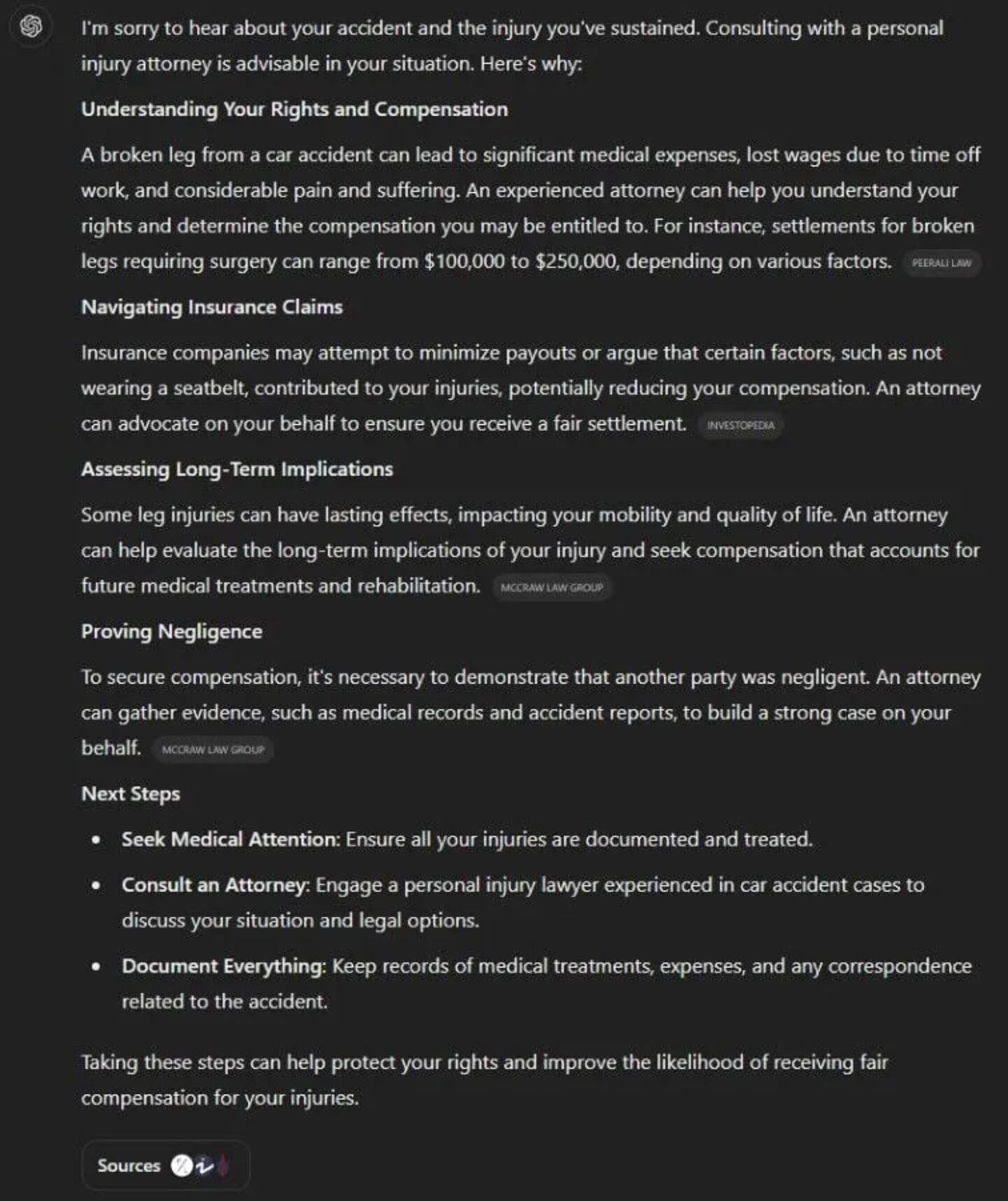 Here is an example of searching for "I was in a car accident and suffered a broken leg. Should I talk to an attorney?" Consultwebs asked this three times and got three very different answers.