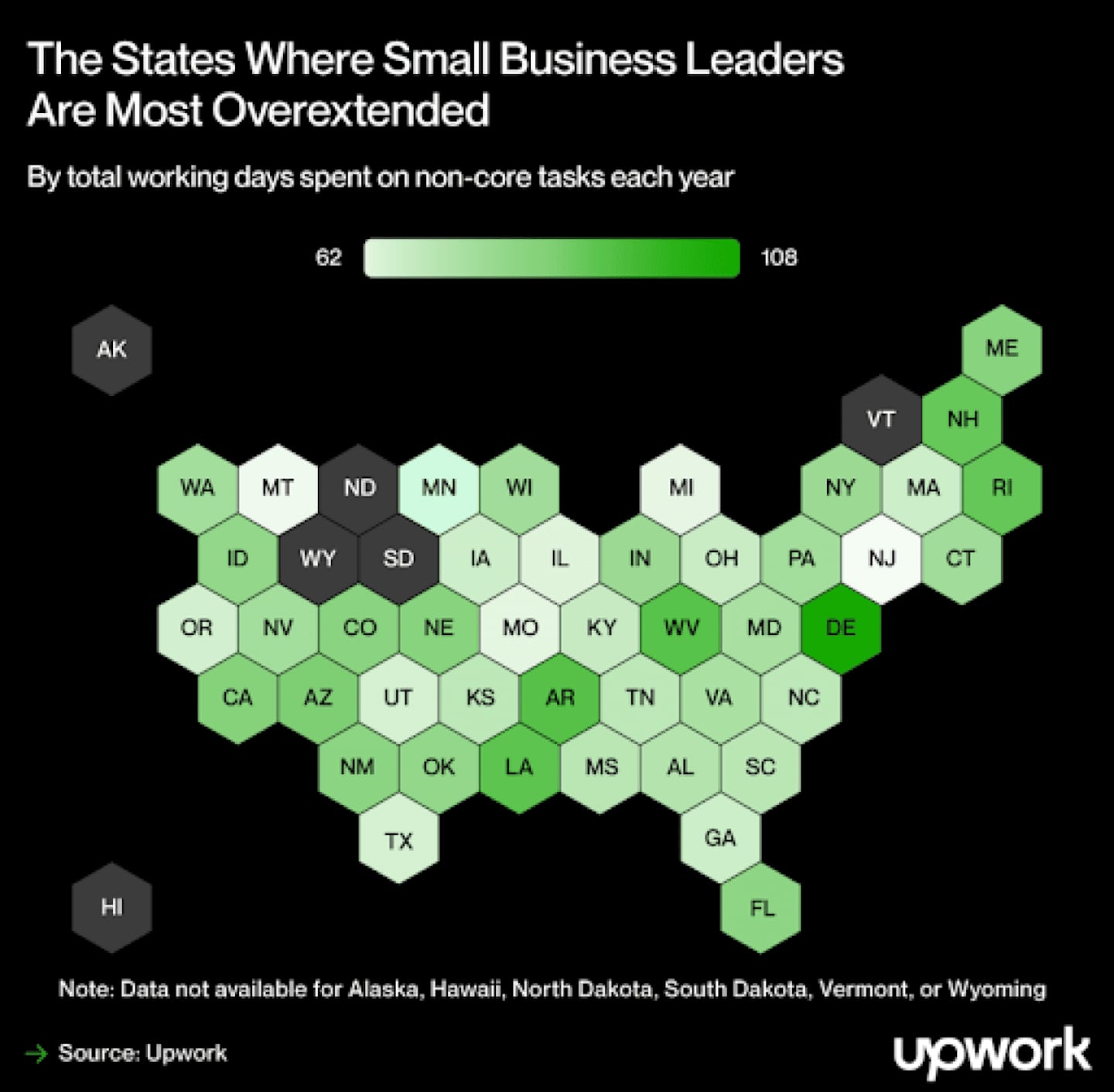 The number of workdays small business leaders spend each year on tasks outside their core role varies widely by state. The five states averaging the most overextended leaders are: