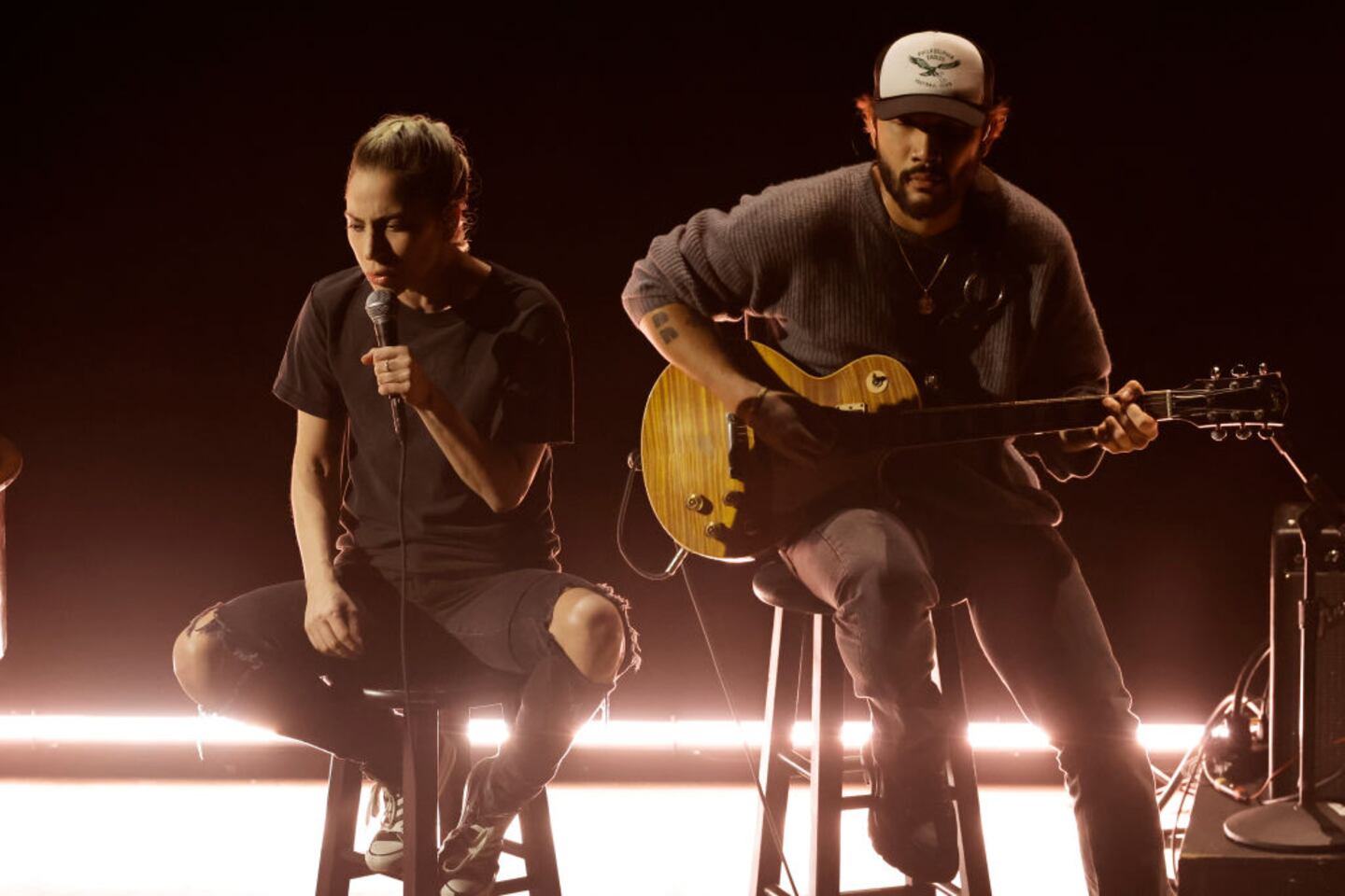 Lady Gaga walked the red carpet — which was champagne-colored for the first time since 1961 — in full makeup and a black gown, but when she took the stage to perform “Hold My Hand” from “Top Gun: Maverick,” she had a toned down, more comfortable look, sporting little to no makeup, a black T-shirt and ripped jeans, USA Today reported.