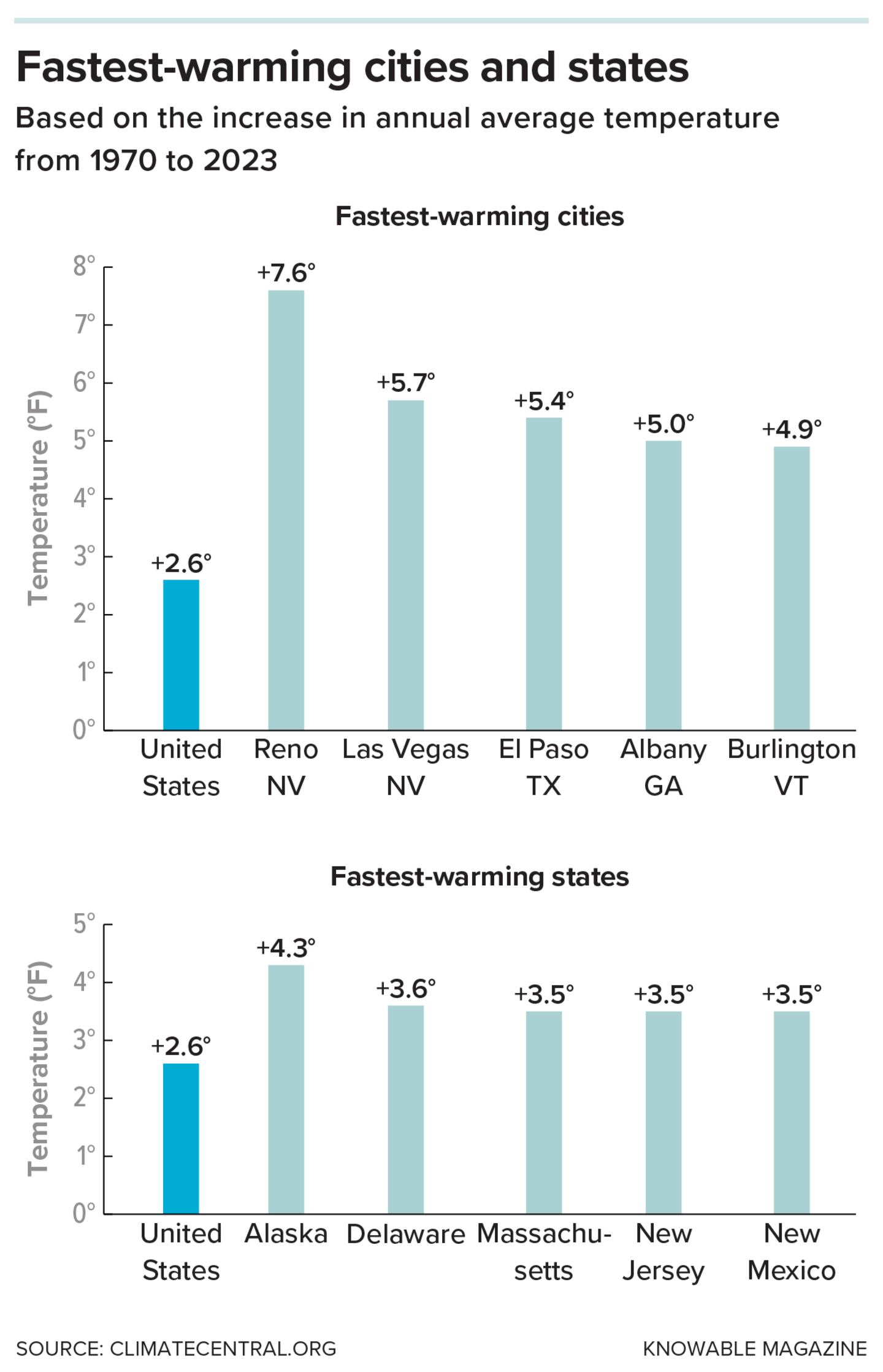 While the country as a whole warmed by 2.6 F on average between 1970 and 2023, Reno saw an increase of 7.6 F. A heat wave that hit Reno in July 2024 made for the hottest month in the Biggest Little City's documented history, Knowable Magazine explains.
